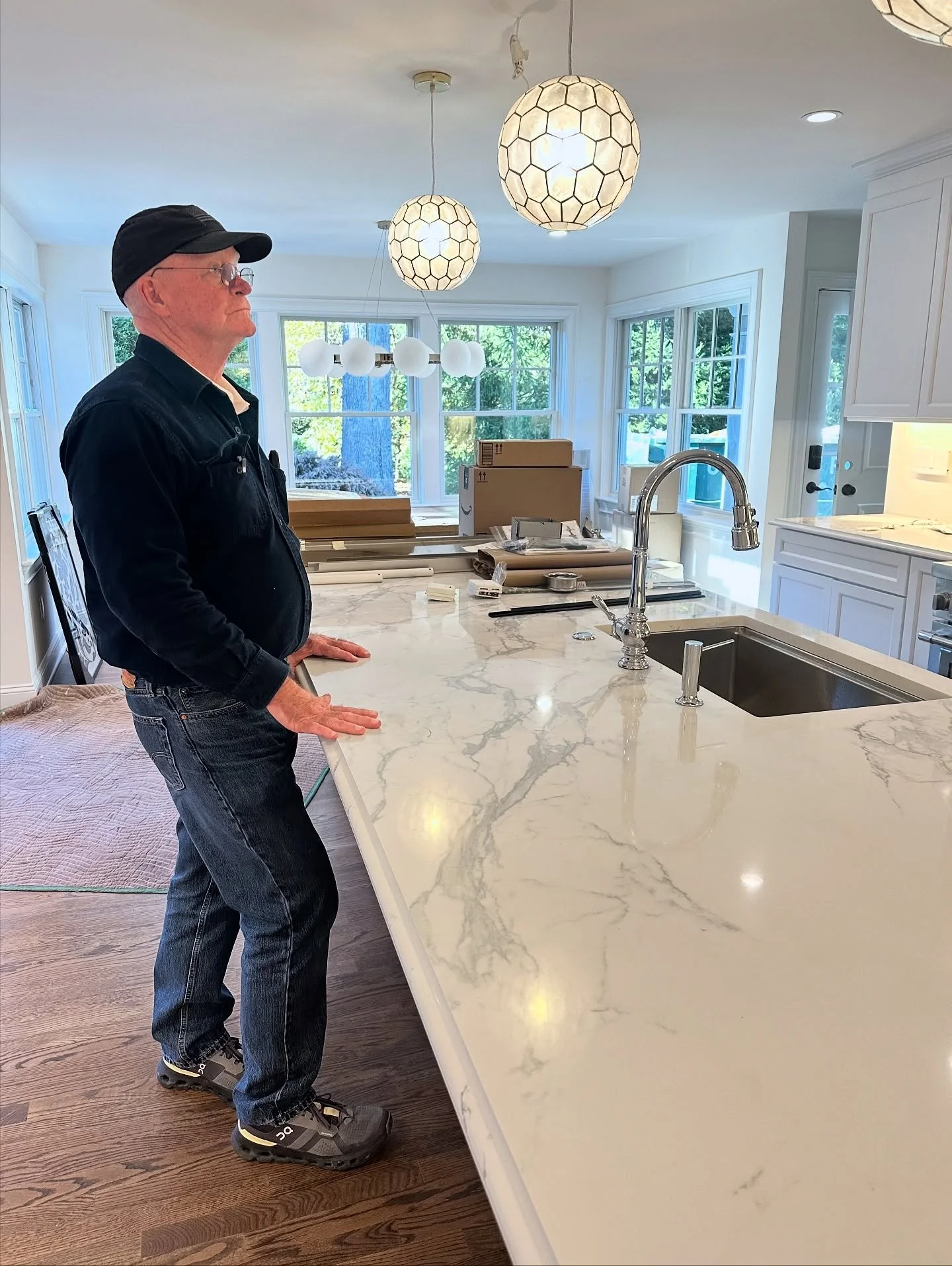 A modern kitchen with white cabinets, marble countertops, a large kitchen island, stainless steel appliances, and hardwood floors.
