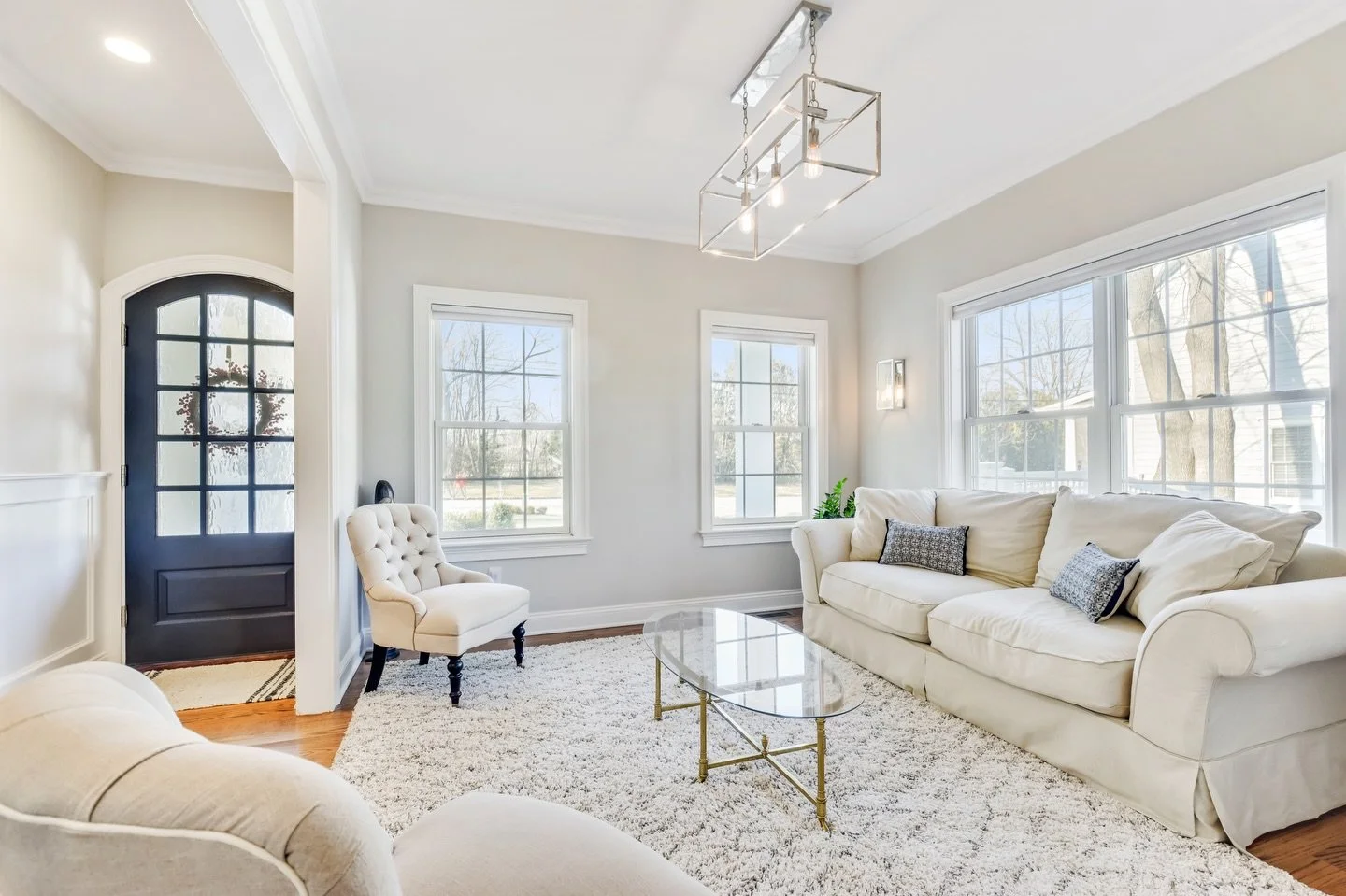 • A two-story white house with black shutters, a covered front porch, and a dark blue front door, surrounded by a well-maintained green lawn and landscaped bushes.